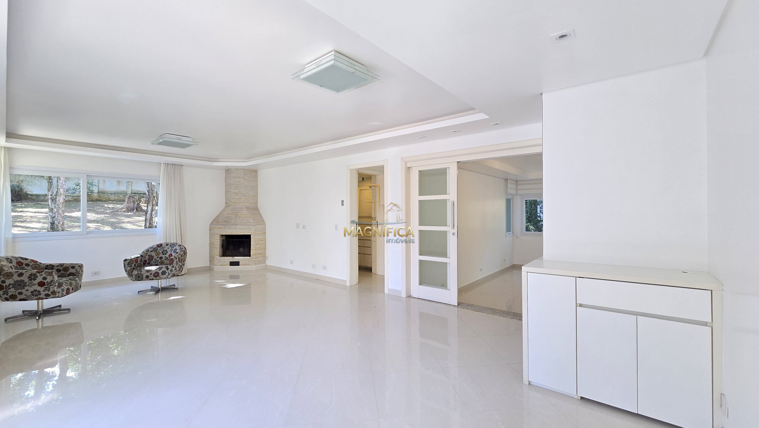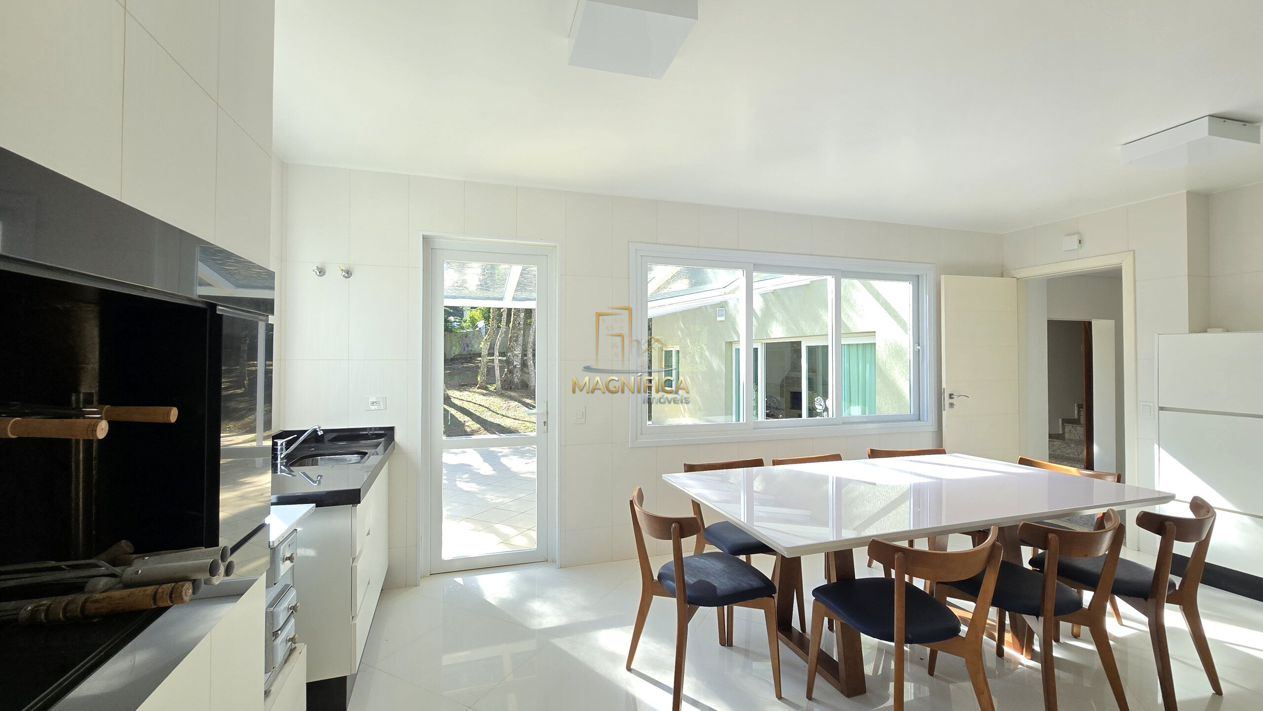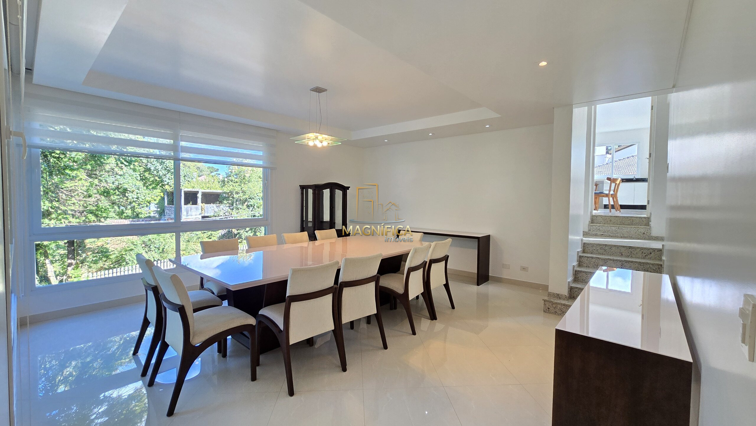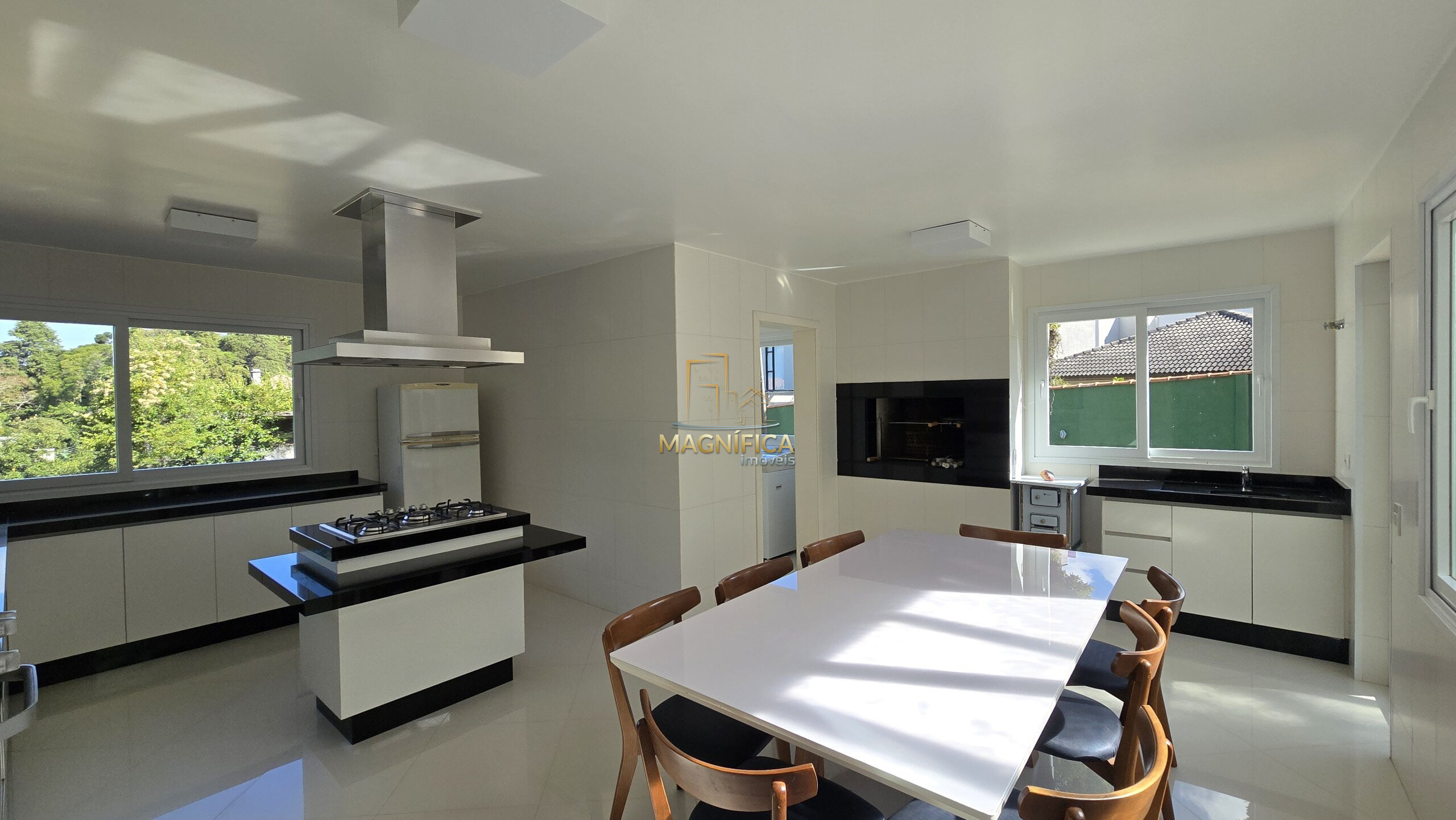 No pavimento térreo, a casa dispõe de três salas aconchegantes — incluindo sala de estar com lareira, sala de jantar com capacidade para até 12 pessoas e um terceiro ambiente versátil. Conta ainda com lavabo, uma suíte térrea ideal para acessibilidade ou hóspedes, além de uma cozinha gourmet espaçosa, com ilha e churrasqueira integrada.