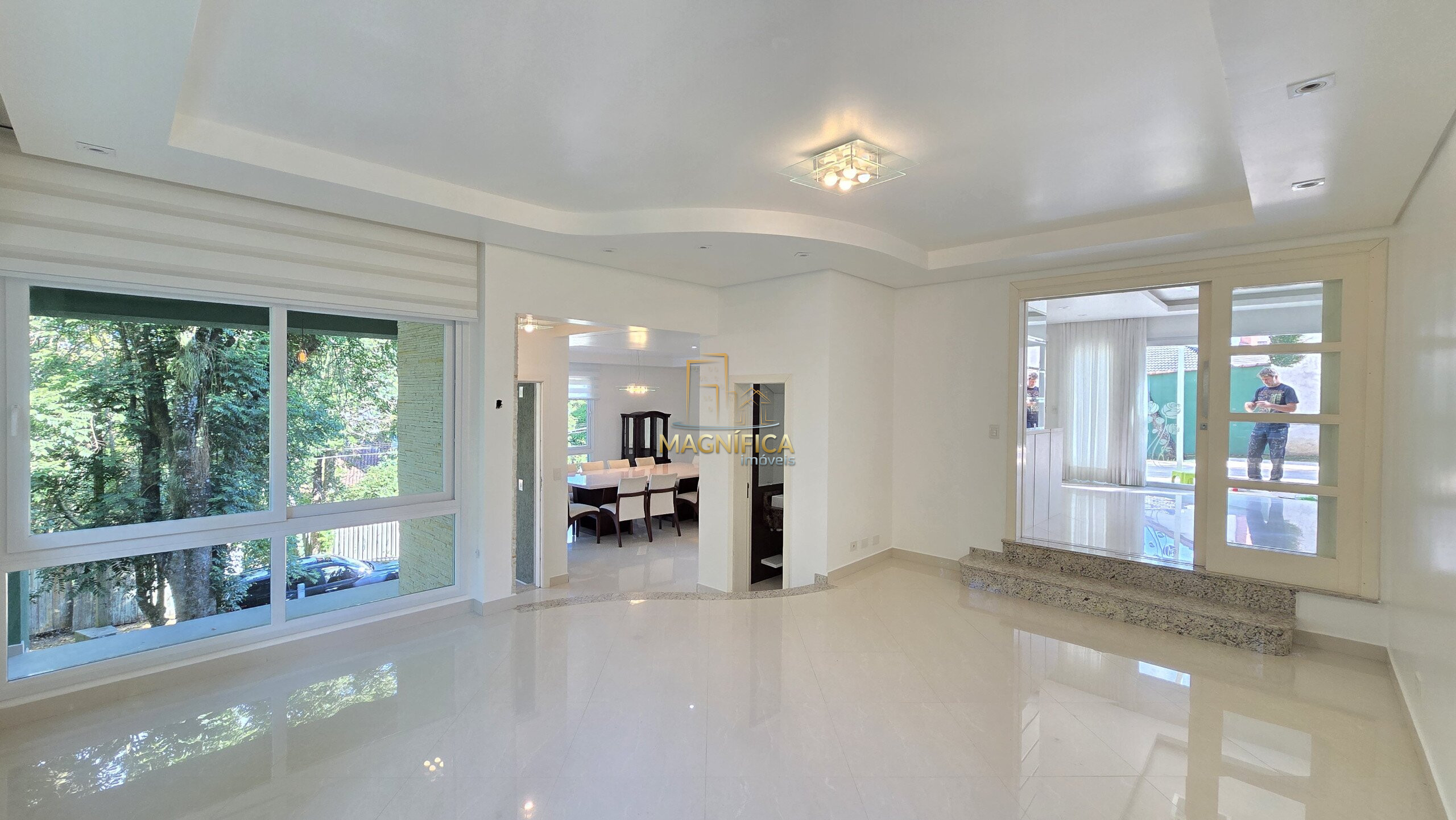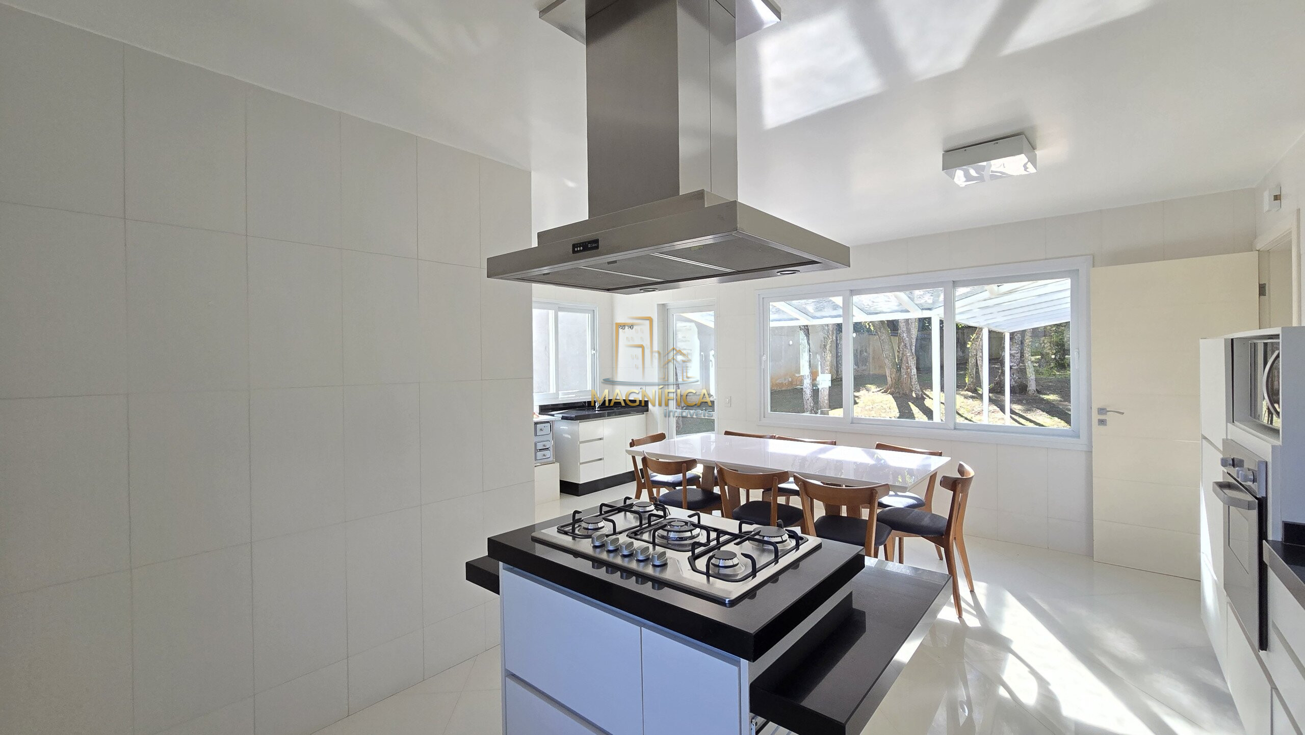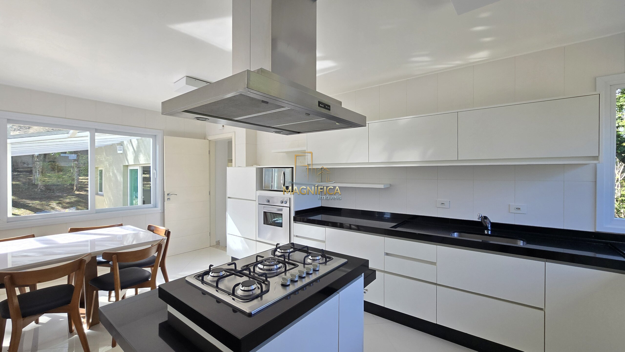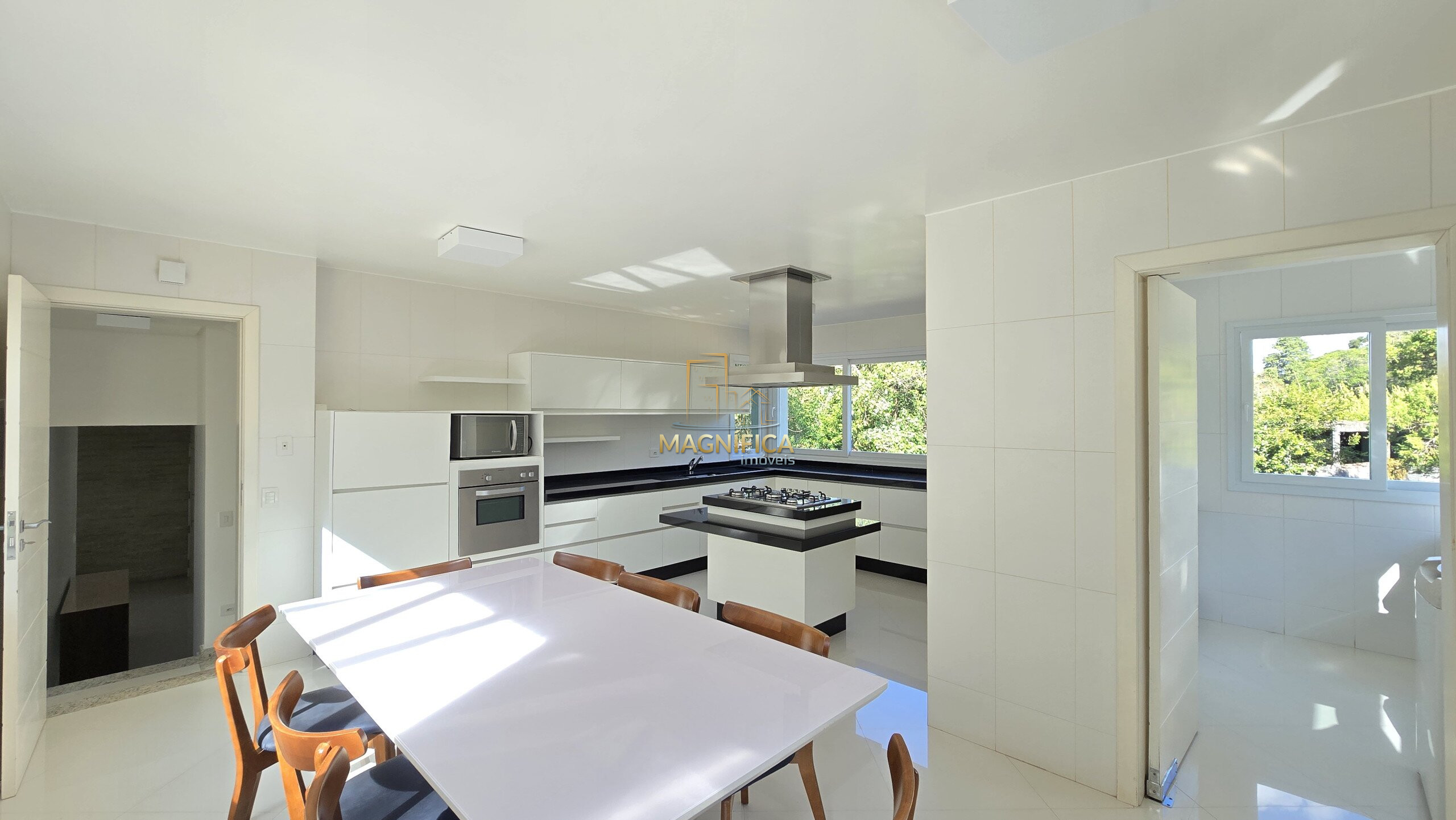 No pavimento térreo, a casa dispõe de três salas aconchegantes — incluindo sala de estar com lareira, sala de jantar com capacidade para até 12 pessoas e um terceiro ambiente versátil. Conta ainda com lavabo, uma suíte térrea ideal para acessibilidade ou hóspedes, além de uma cozinha gourmet espaçosa, com ilha e churrasqueira integrada.