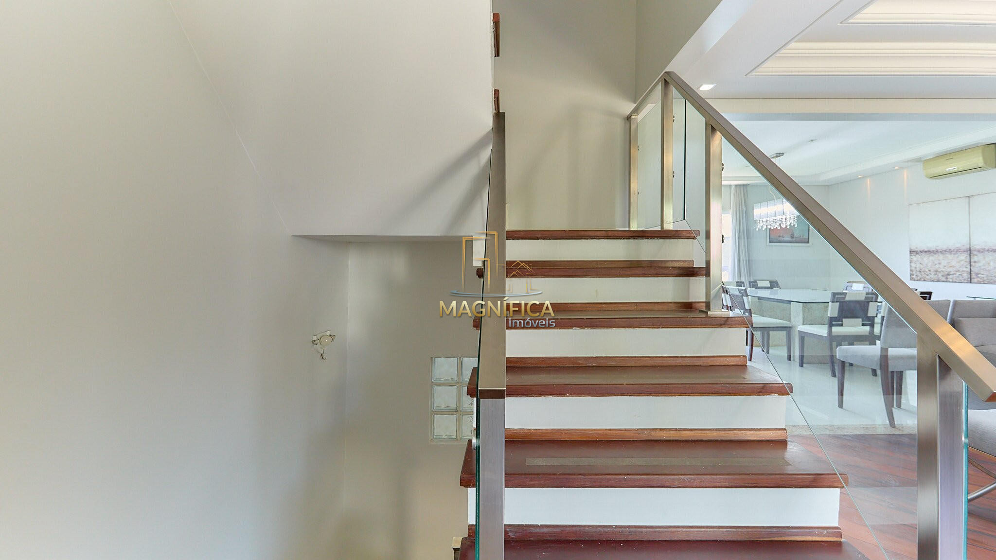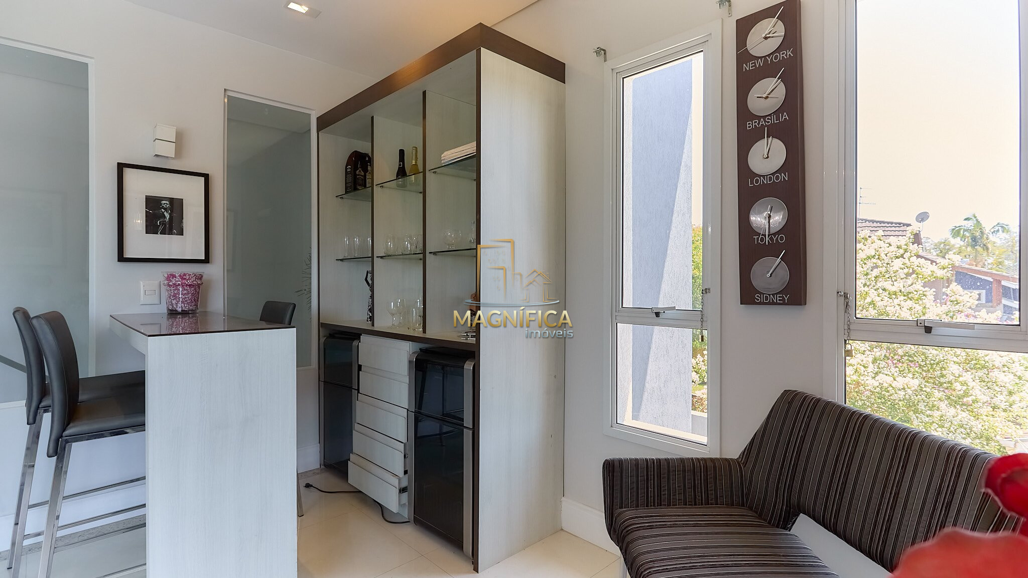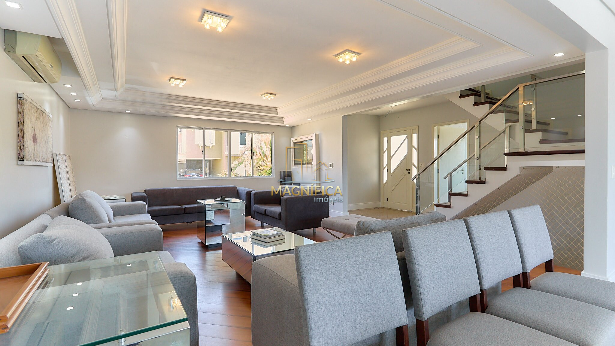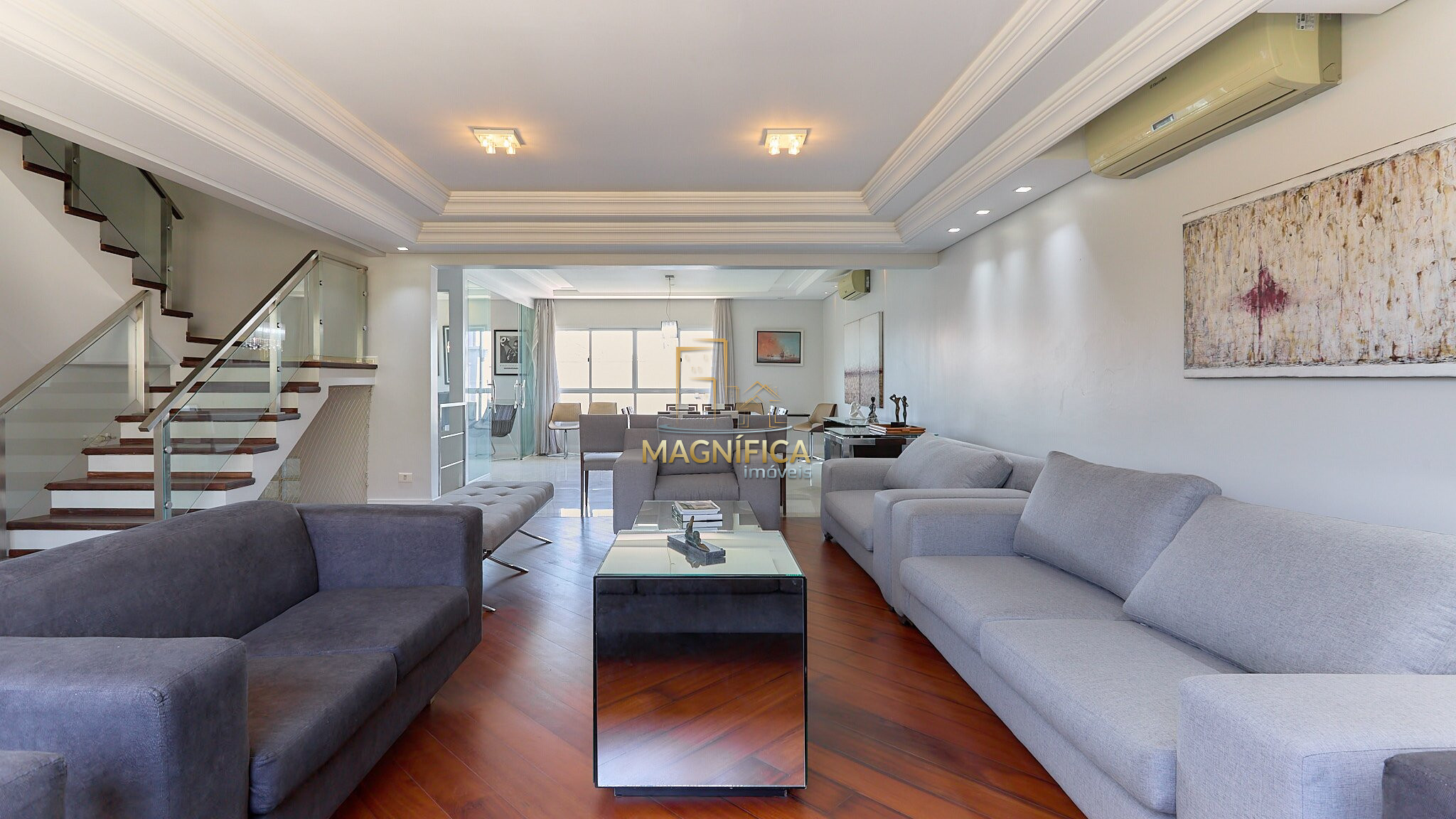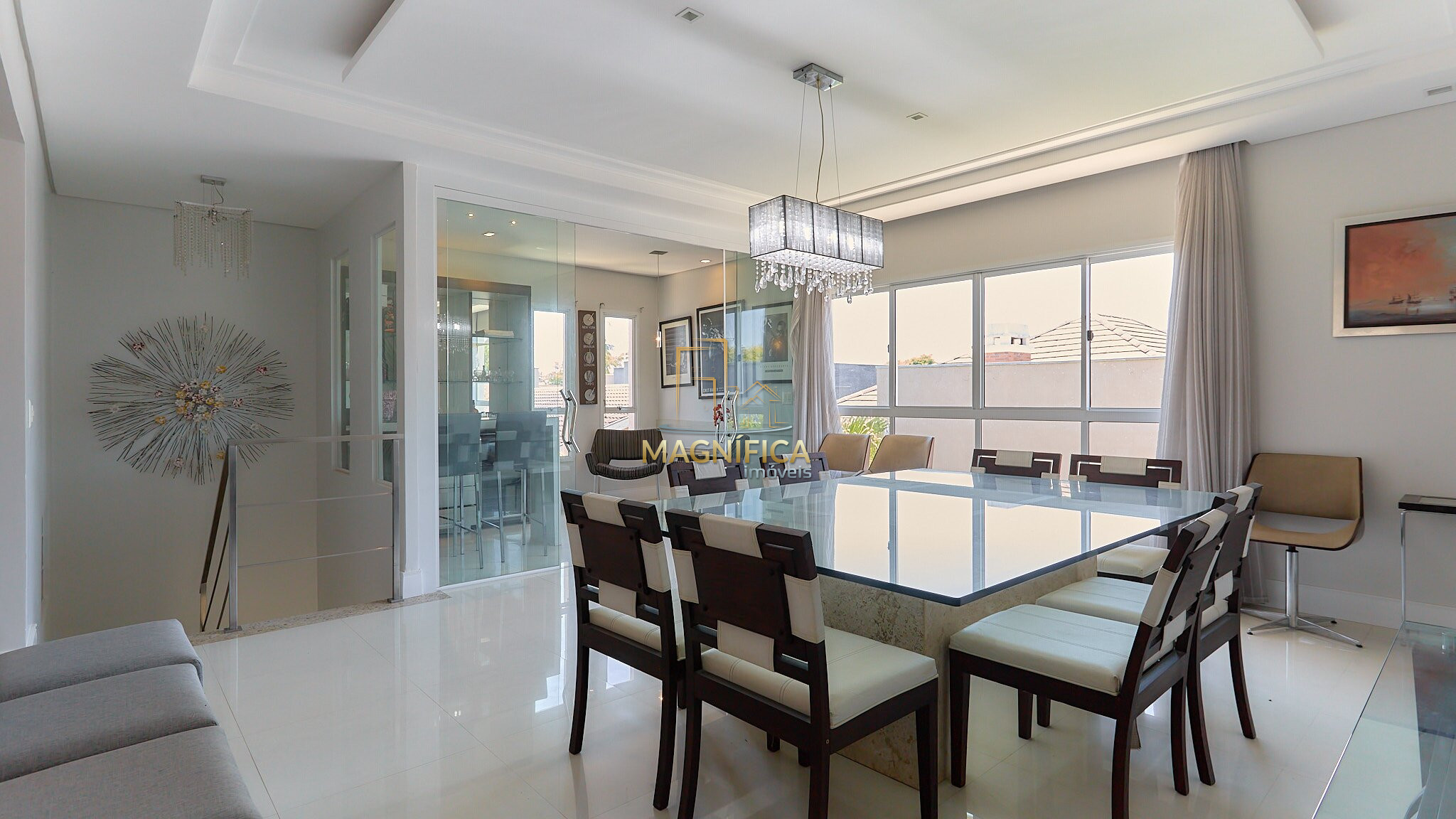 Hall de entrada, lavabo e ampla área social composta por salas de estar e jantar. Ambiente separado para bar/adega com fechamento em vidro, além de copa integrada à cozinha.