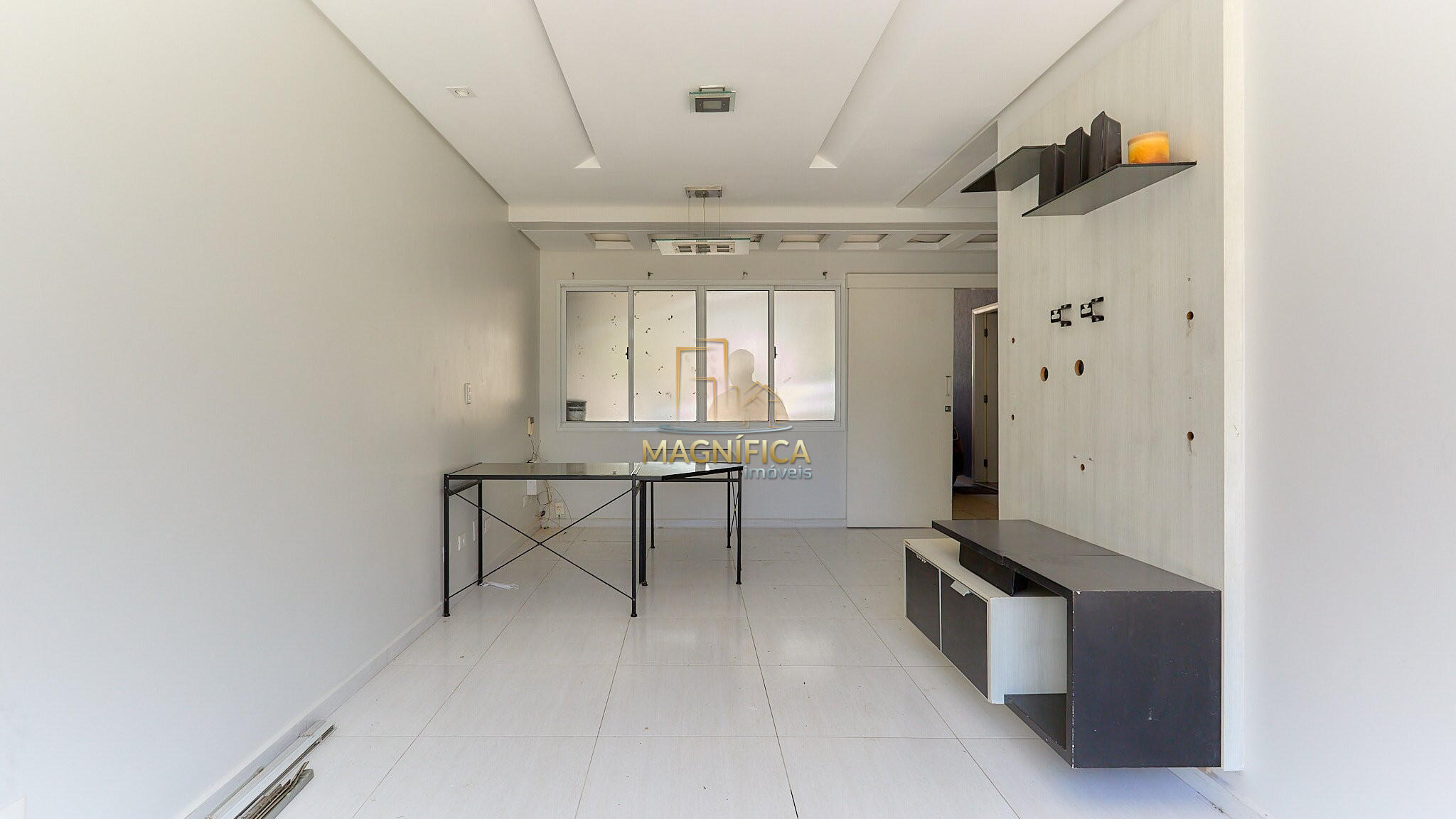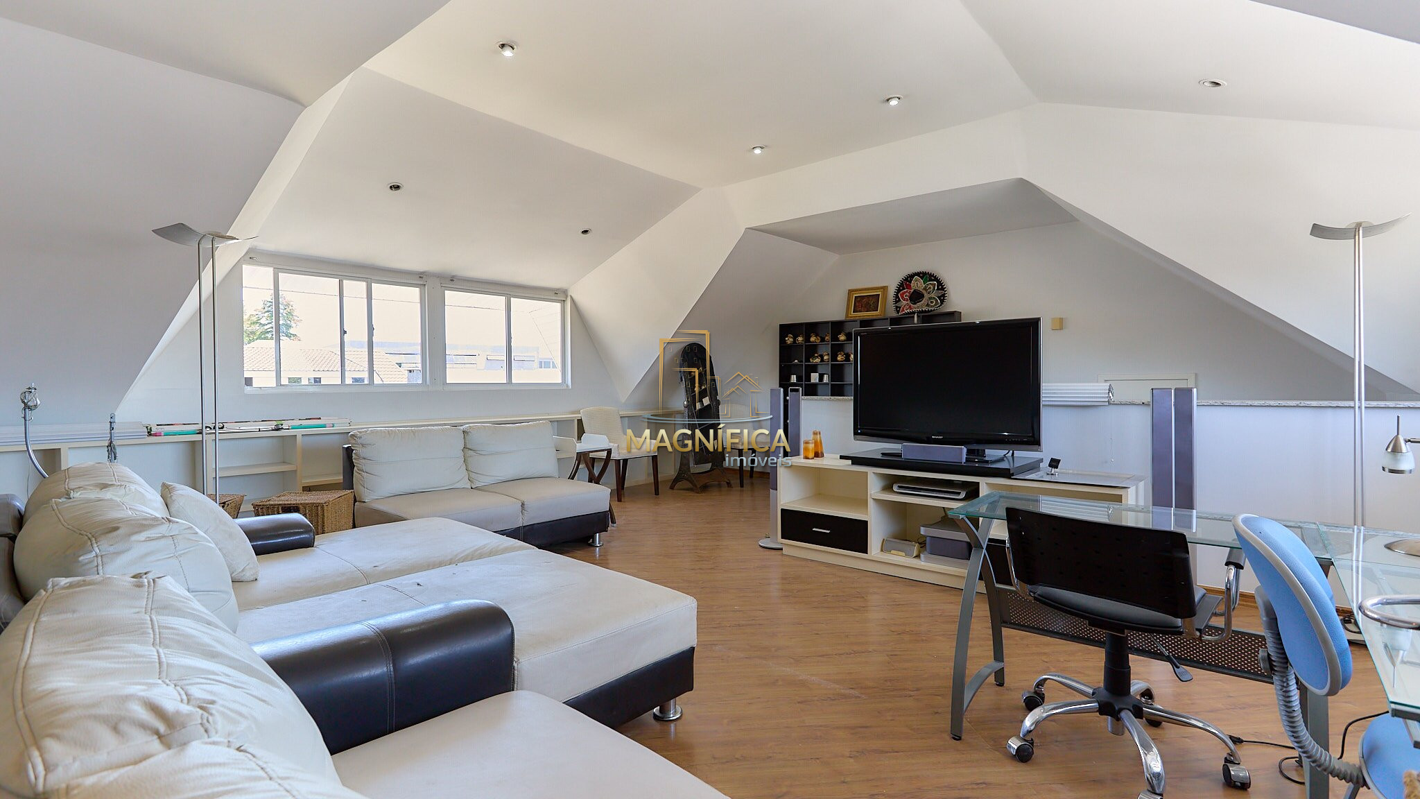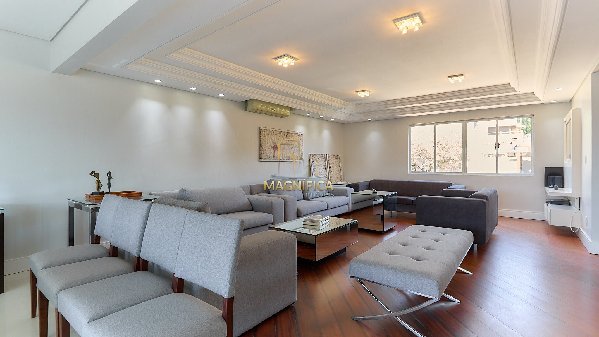 Sala de convivência com aproximadamente 45m² e pé-direito alto.