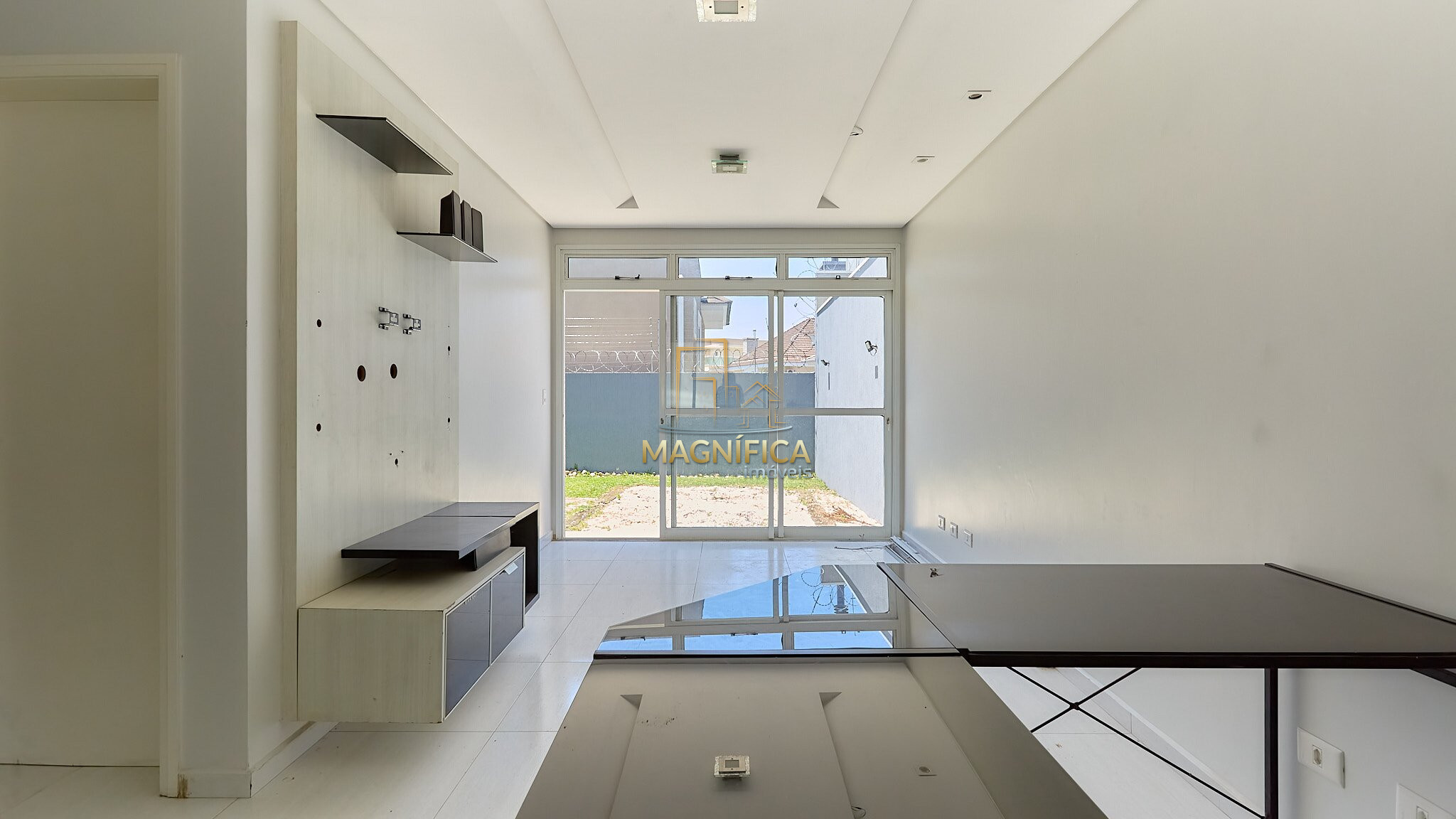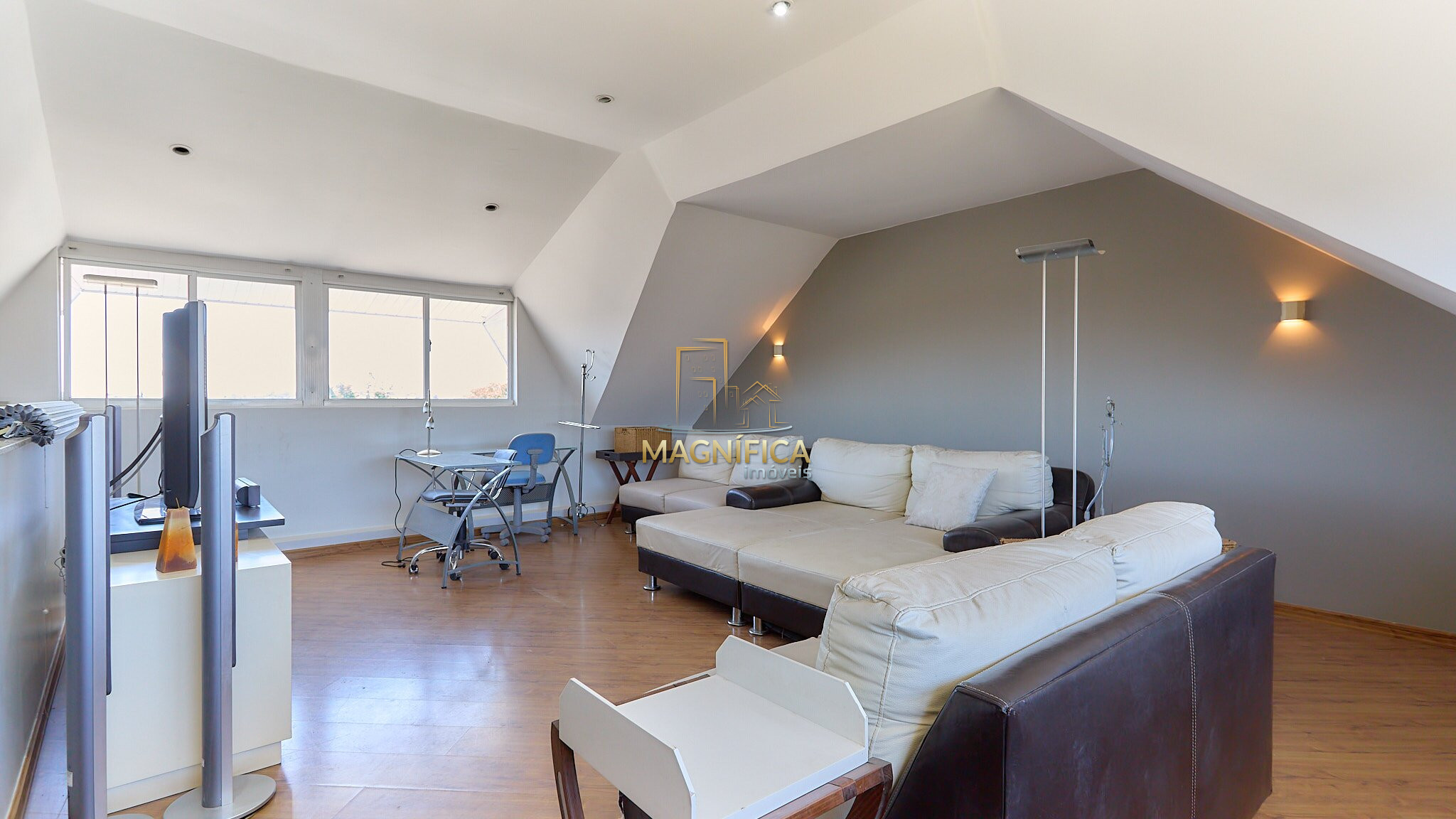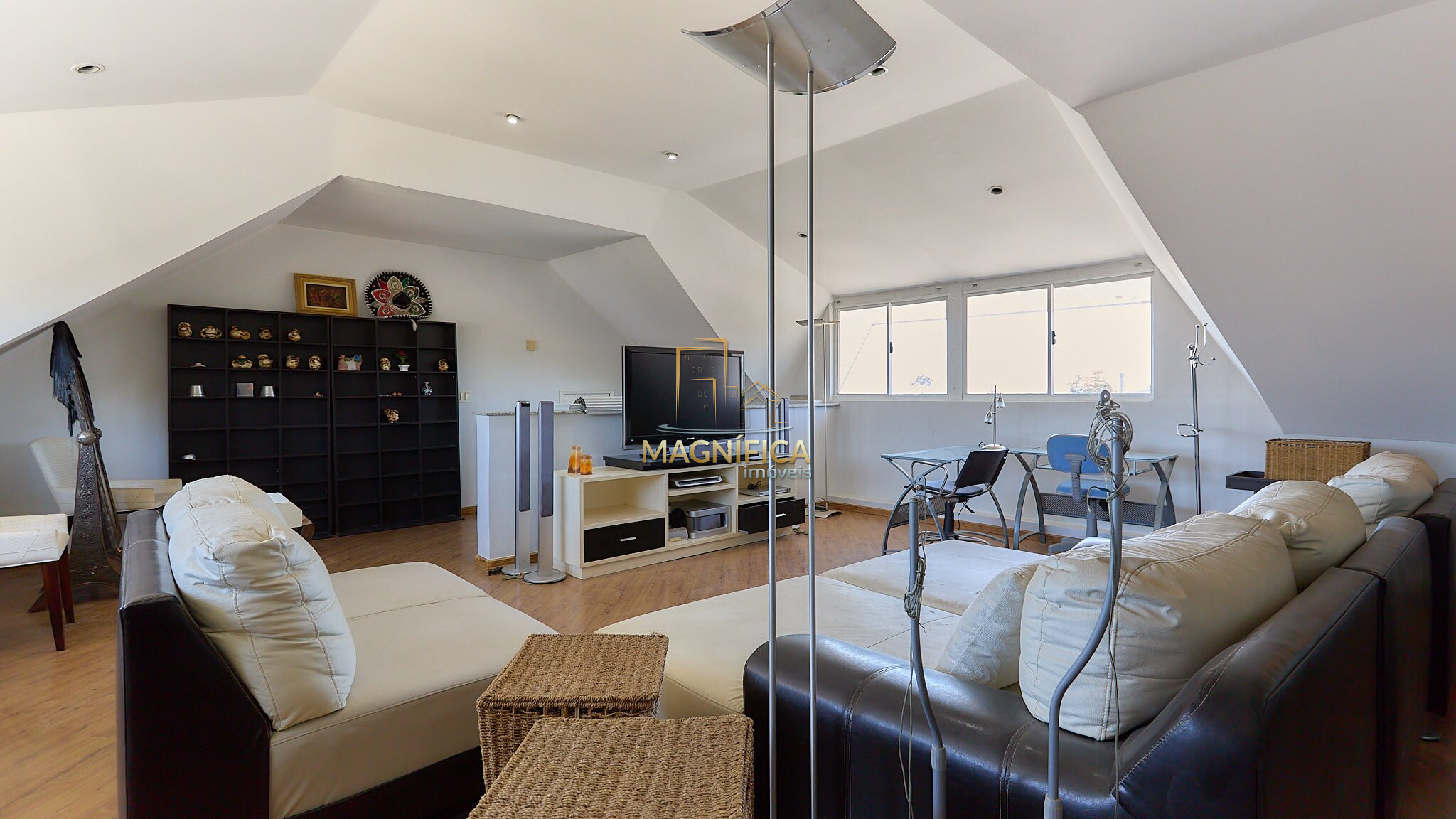 Sala de convivência com aproximadamente 45m² e pé-direito alto.