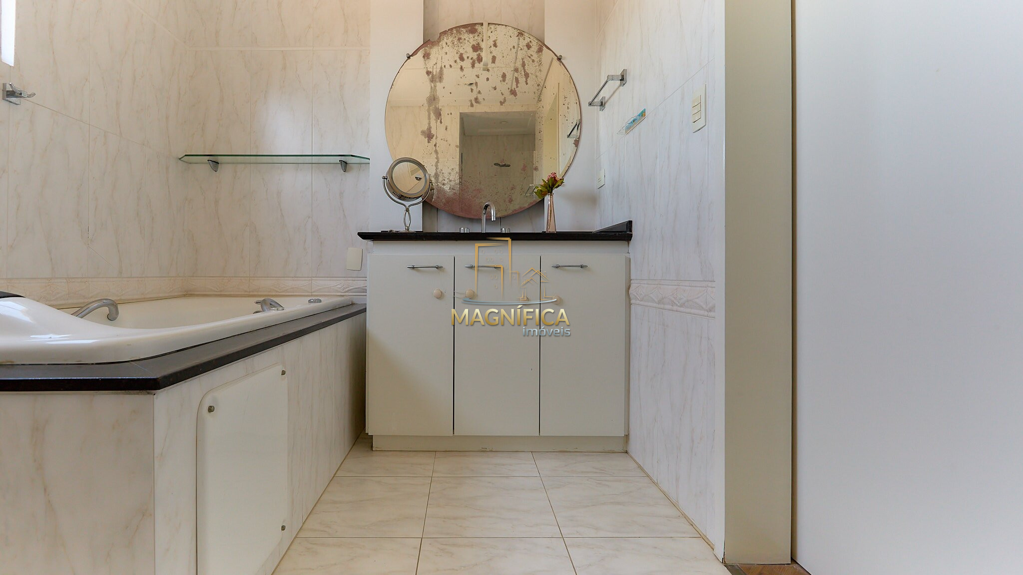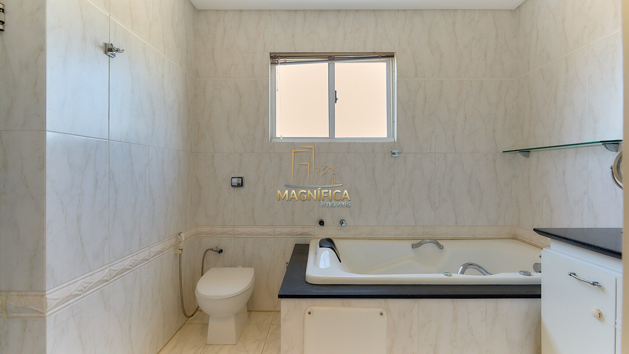 Suíte principal com closet e banheira de hidromassagem, mais uma suíte, um quarto e banheiro social.