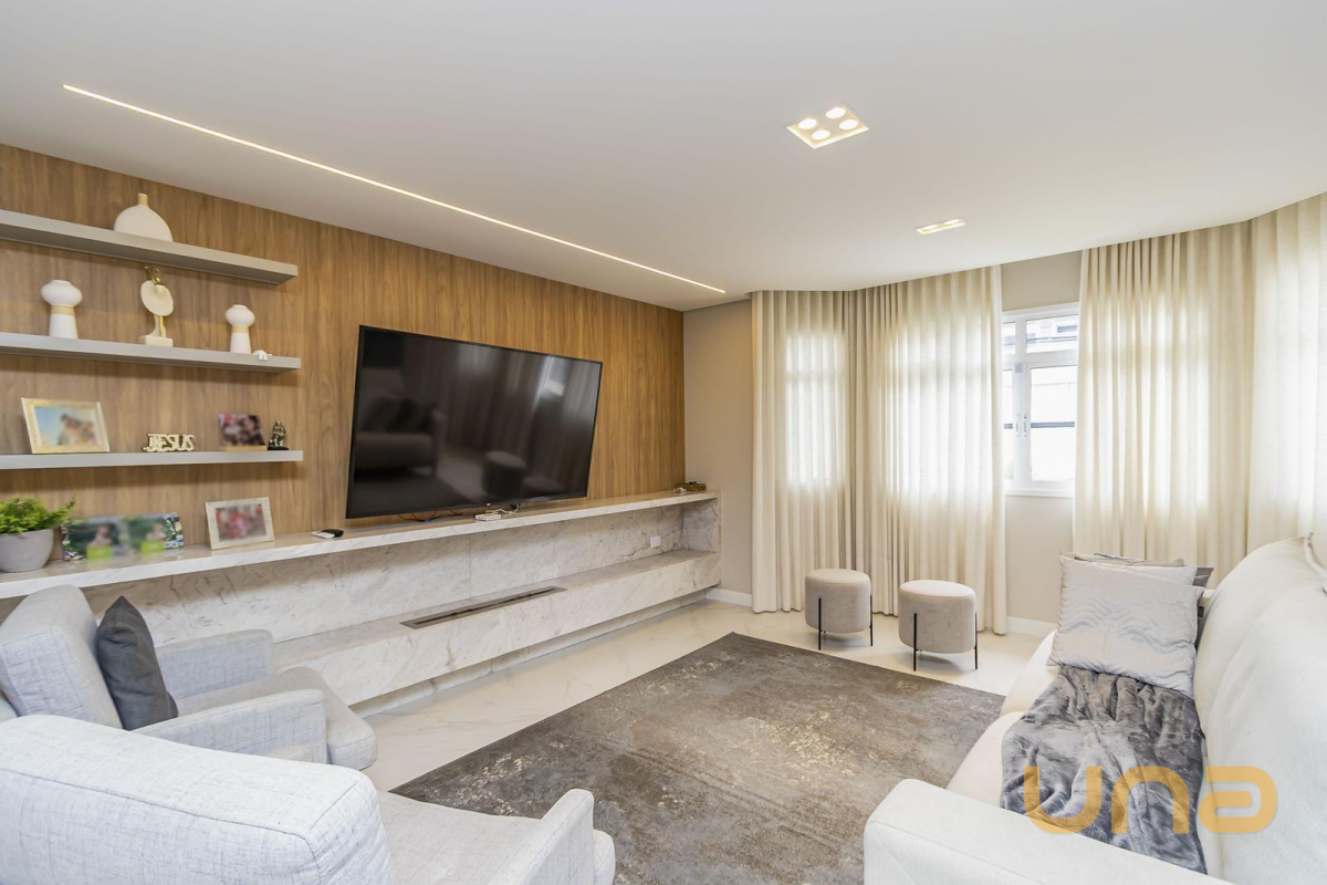 * Sala de estar com painel, sofá, cortina, luminária e lareira