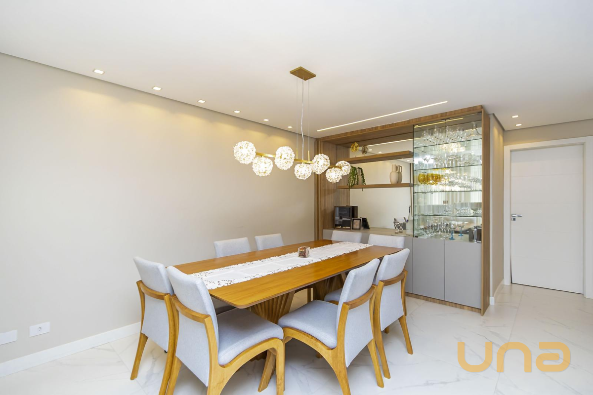 * Sala de jantar com mesa para 8 lugares, lustre e cristaleira