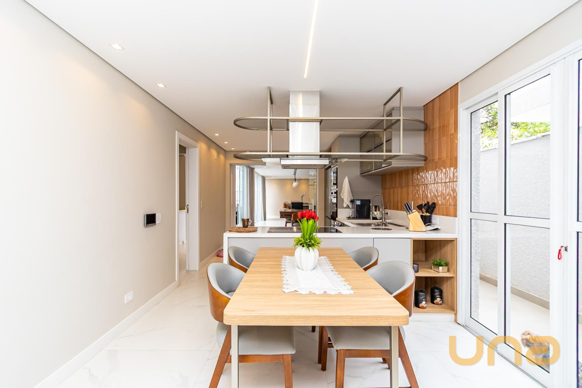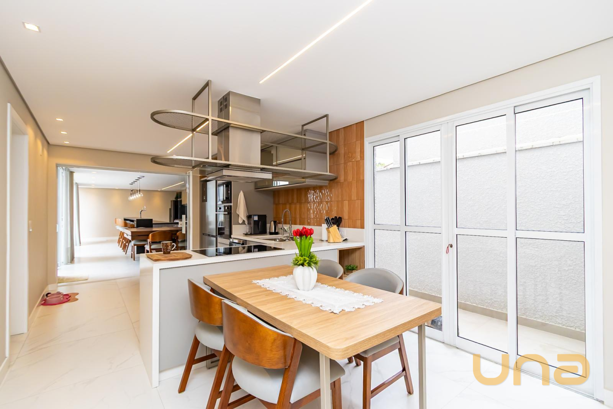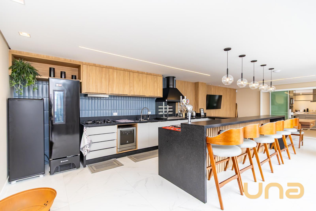 * Cozinha planejada equipada com: geladeira de 4 portas, fogão de indução, forno, coifa, micro-ondas, lava-louça e mesa com 4 cadeiras