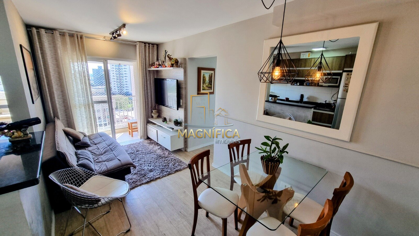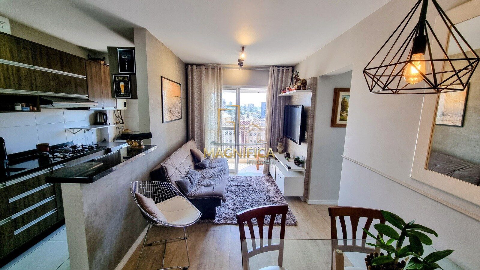 0Sala ampla integrada à sacada com churrasqueira