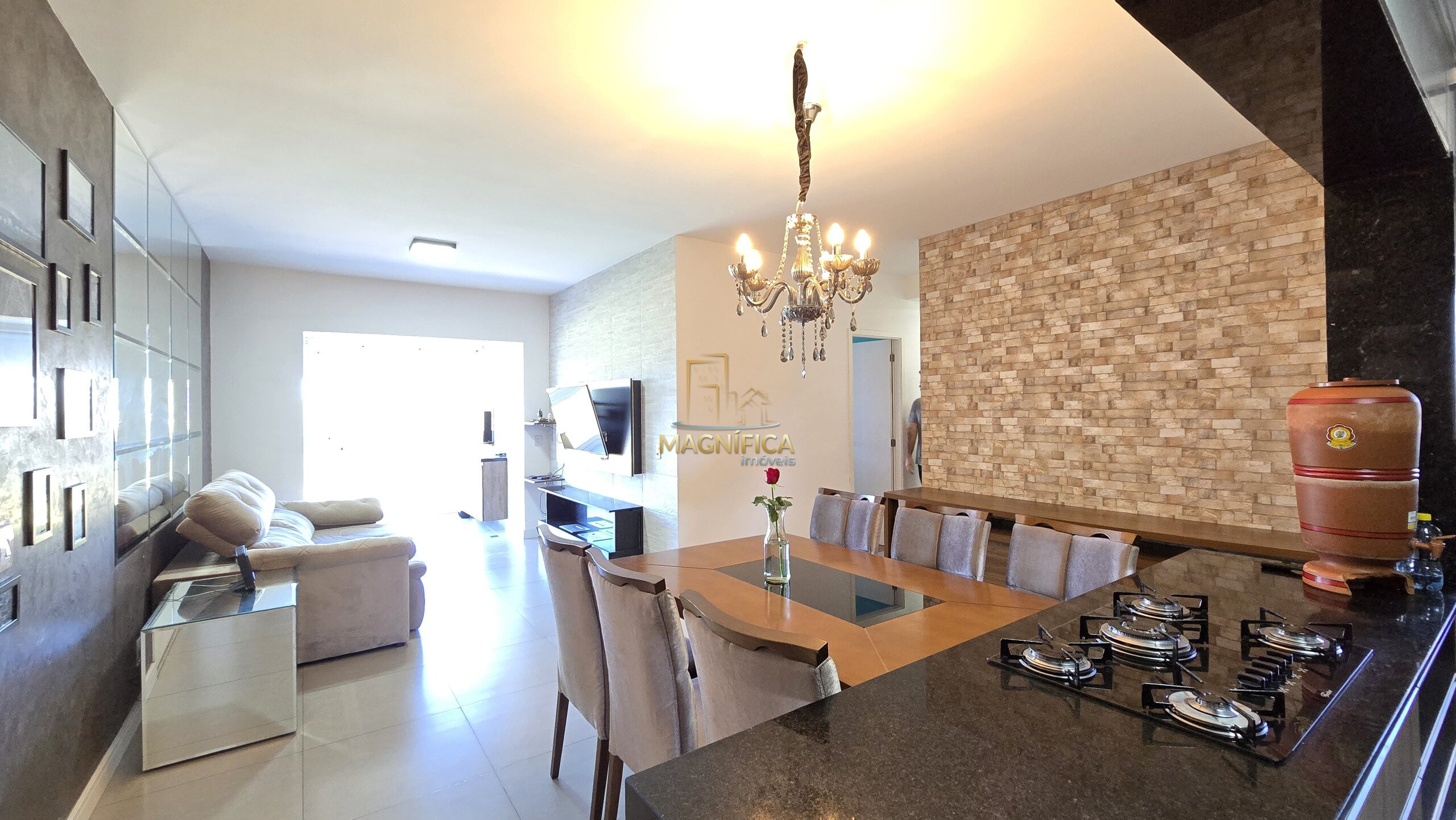 Ampla sala de estar e jantar integradas, proporcionando um ambiente aconchegante e ideal para receber amigos e familiares