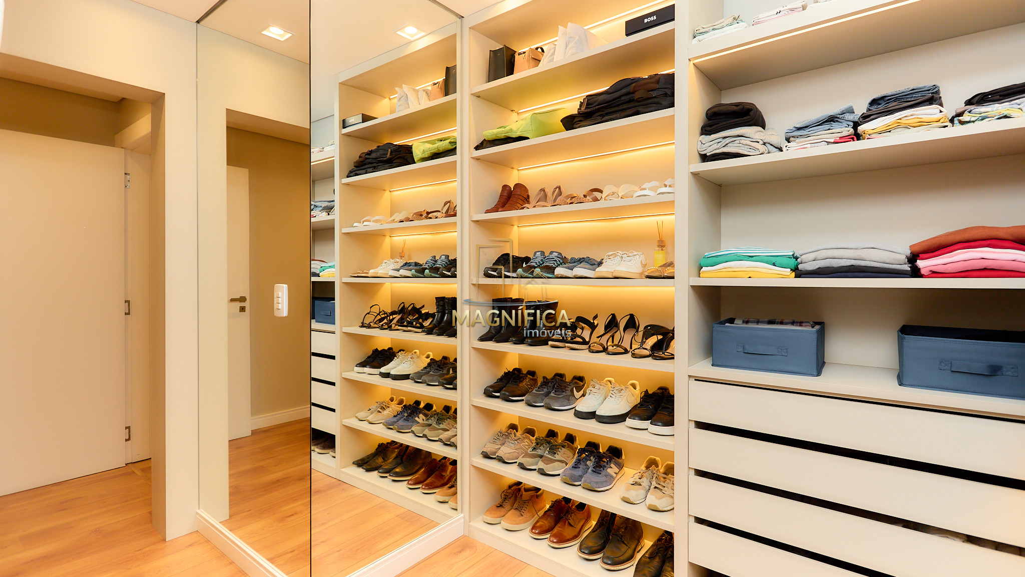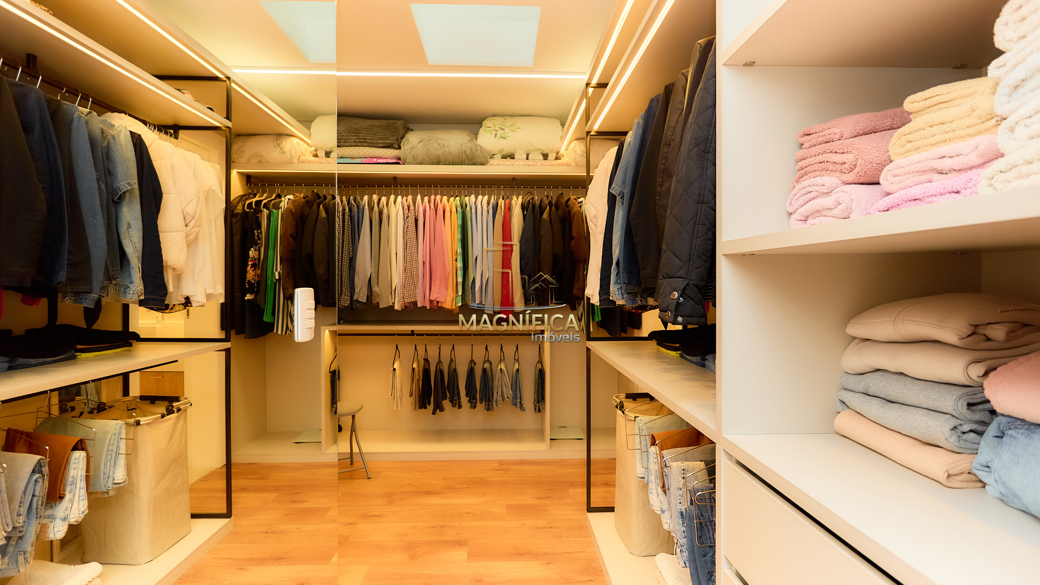 Suíte master com closet generoso e banheiro com duas pias e dois chuveiros;