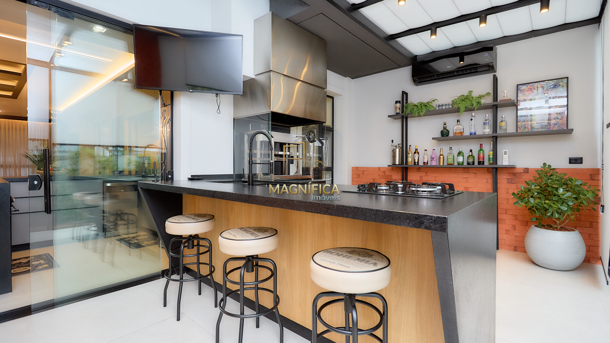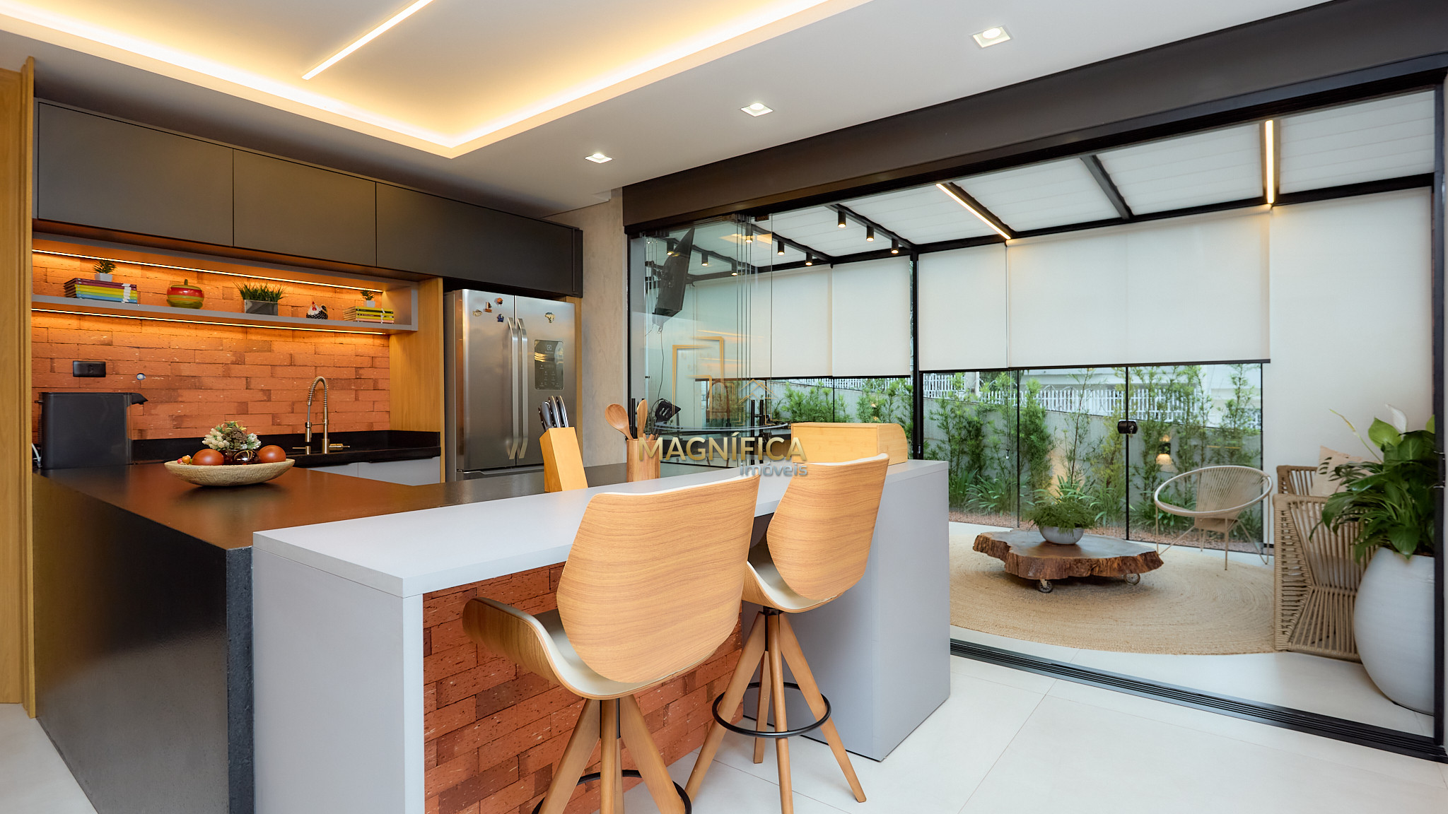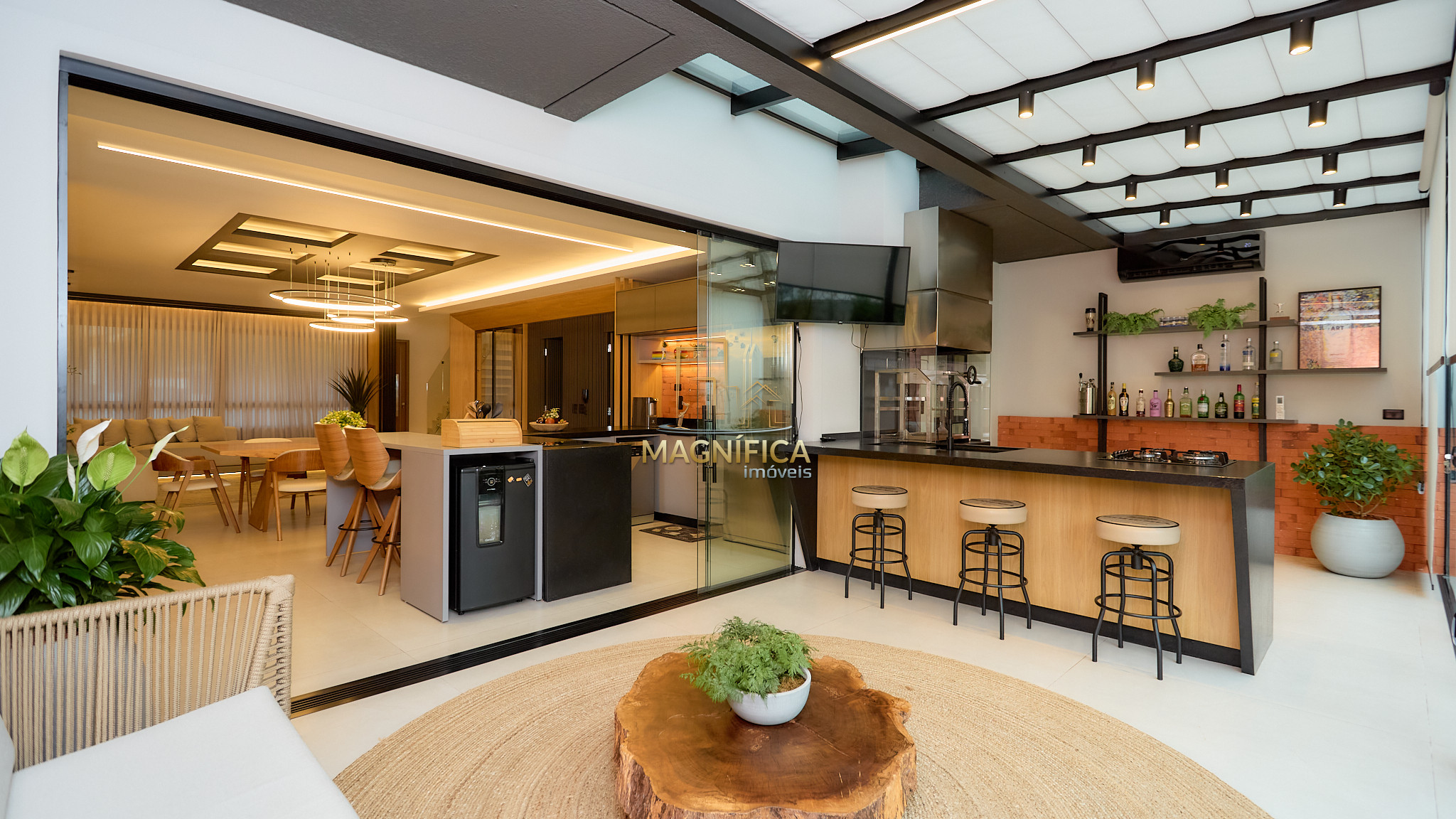 Espaço gourmet completo, com churrasqueira e integração com a área externa;