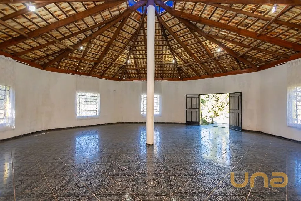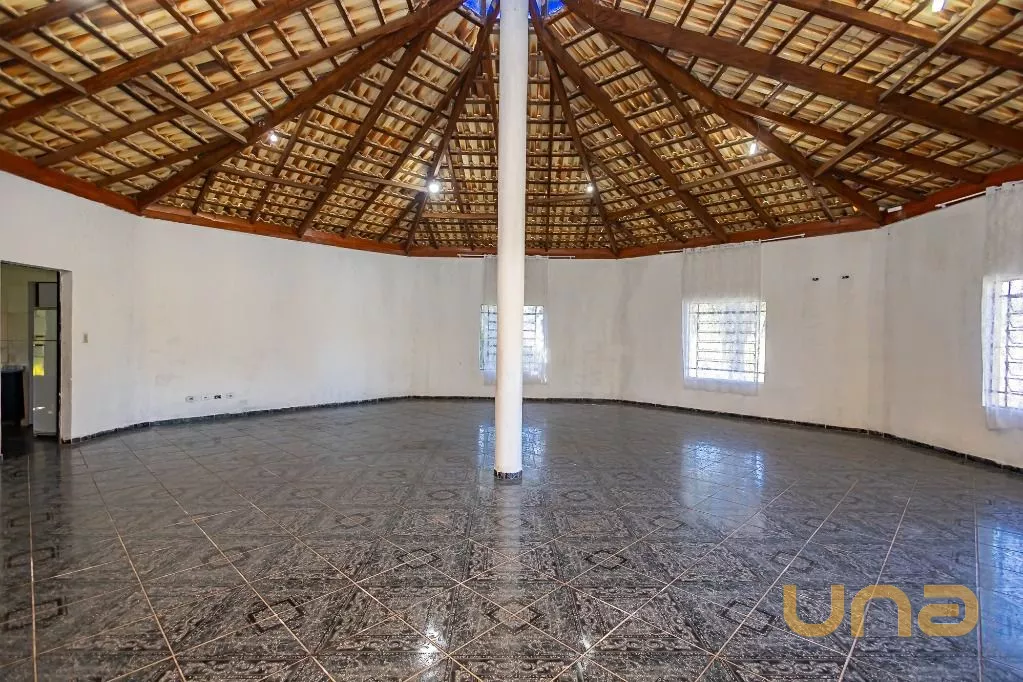 Amplo salão de festas com banheiros, cozinha, salão auxiliar, churrasqueira e forno a lenha.