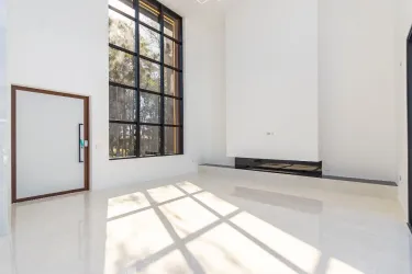 Sala de estar: Pé-direito duplo, fachada com painéis ripados em alumínio tom amadeirado, lareira a gás, janelas em pele de vidro, porta de correr de 4 folhas em alumínio preto e piso em porcelanato polido 1,20x1,20m (marca Helena).