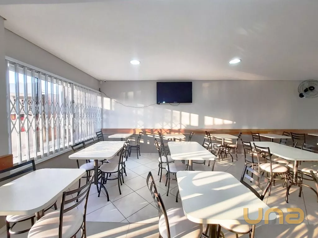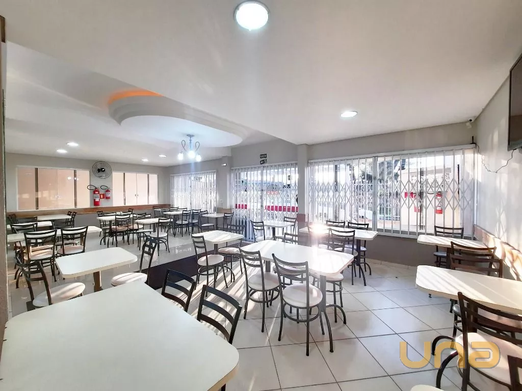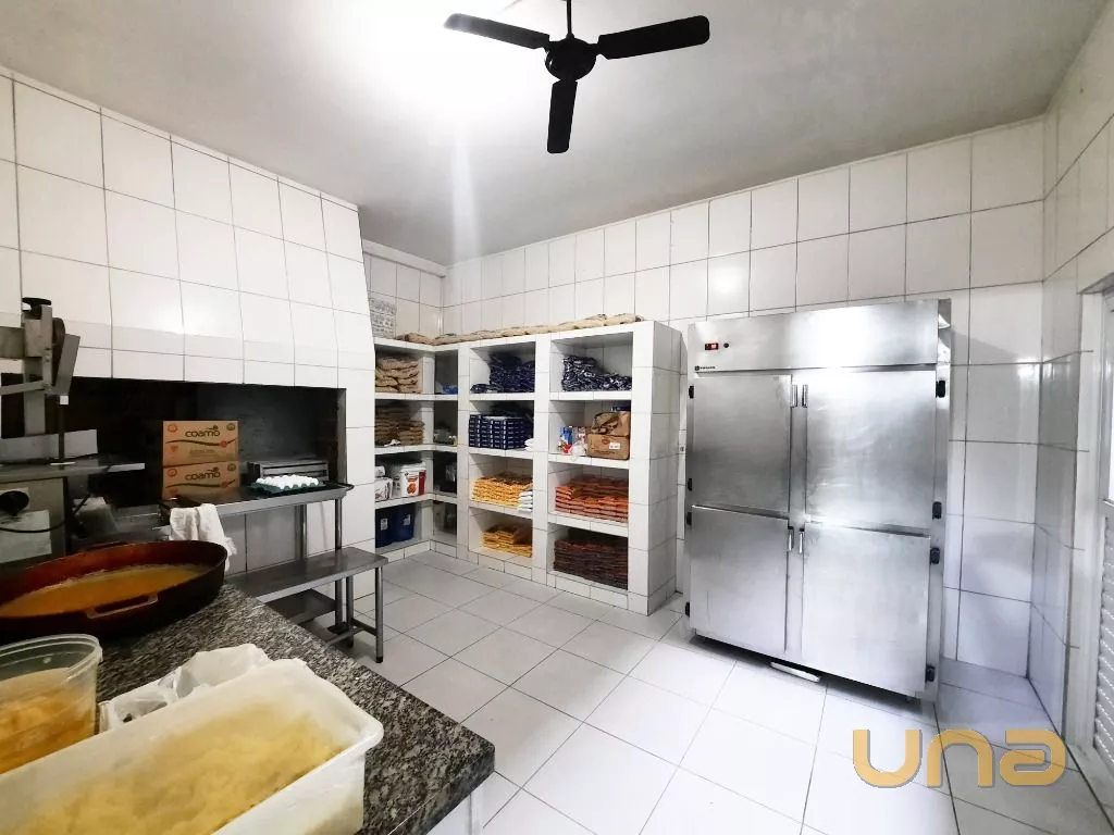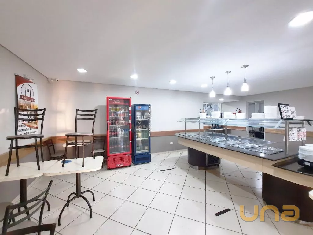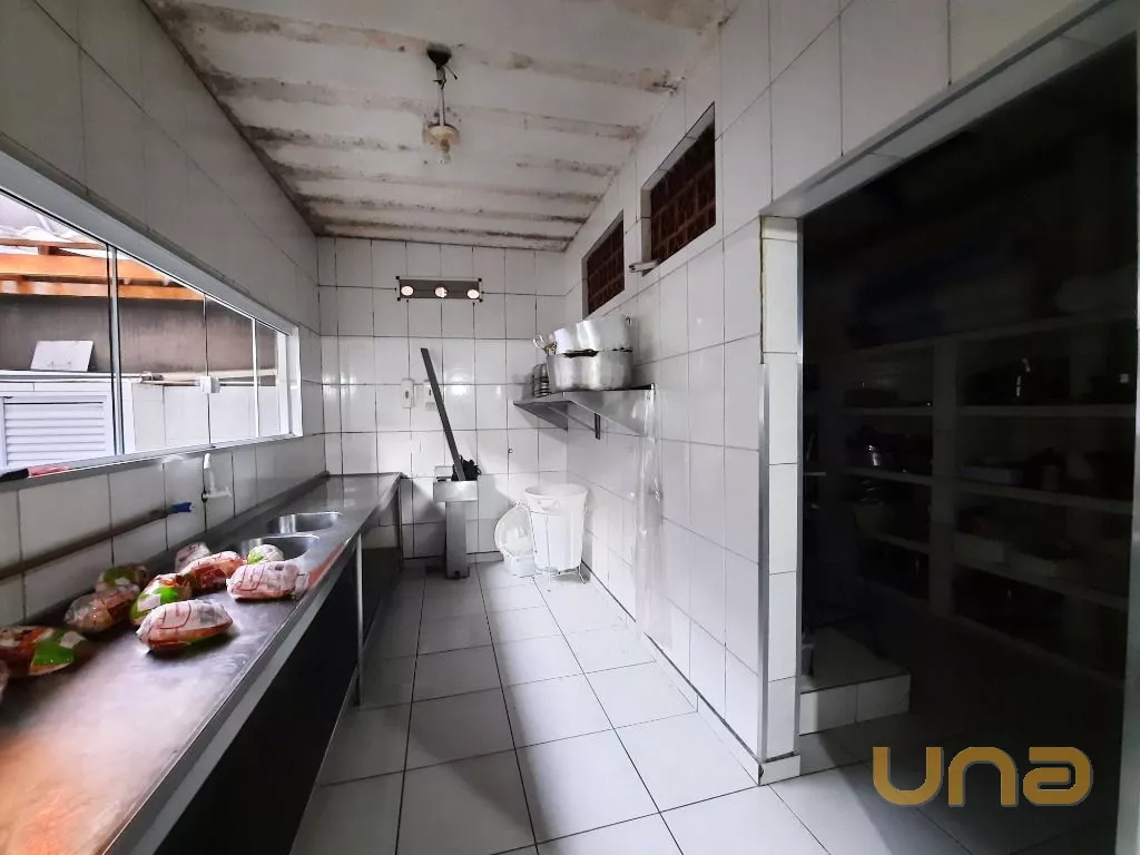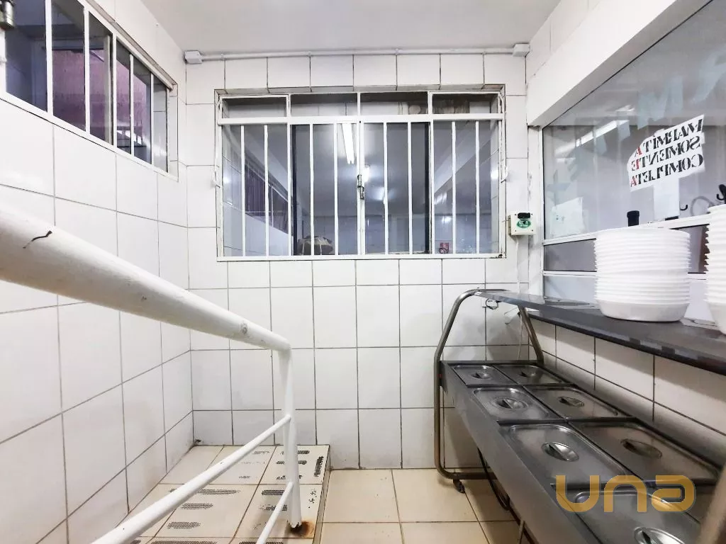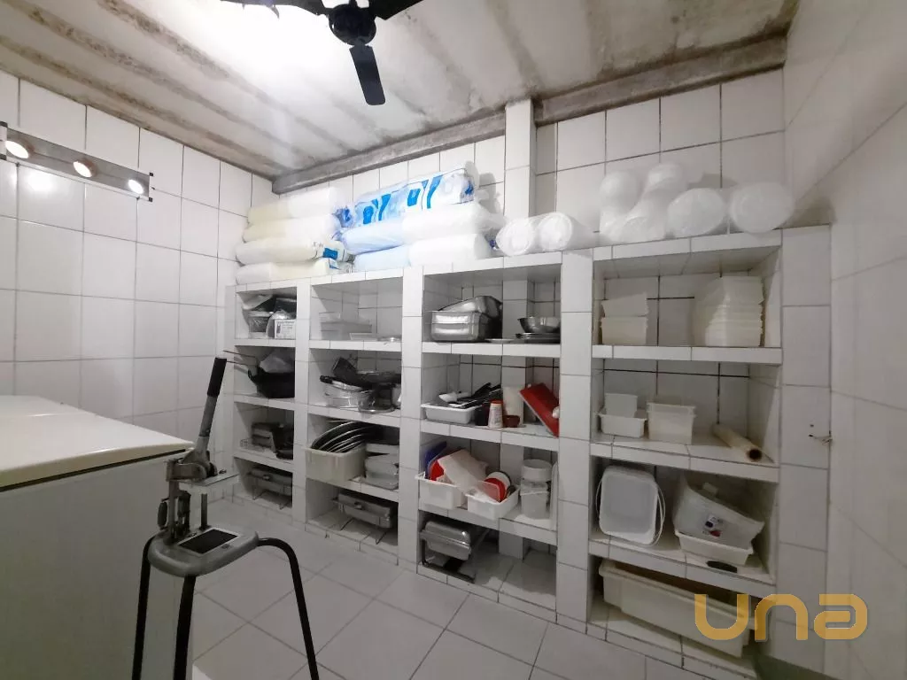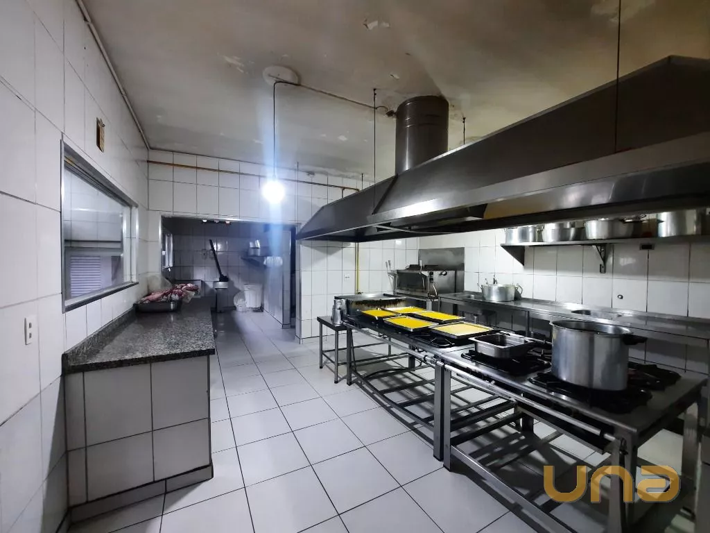 Salão amplo em vão livre, com mesas, cadeiras, buffet, recepção, sala de apoio com pratos, copos e talheres, cozinha de apoio com cuba, geladeira e buffet para marmita, banheiro feminino, masculino e PNE, despensa para alimentos, despensa para embalagens e cozinha ampla completa