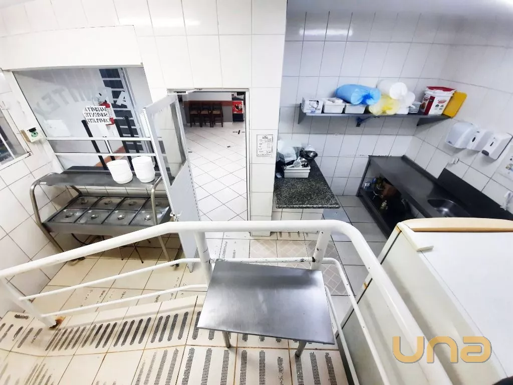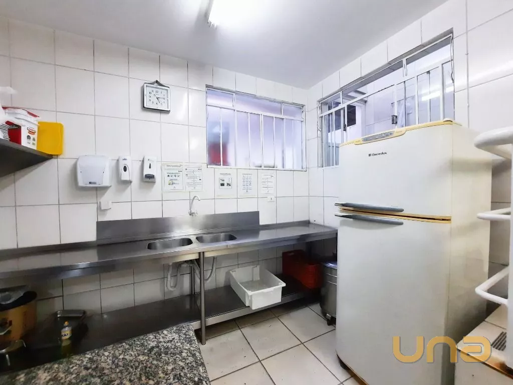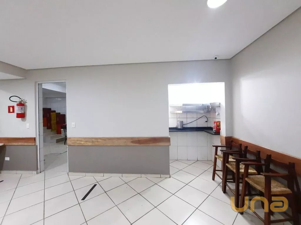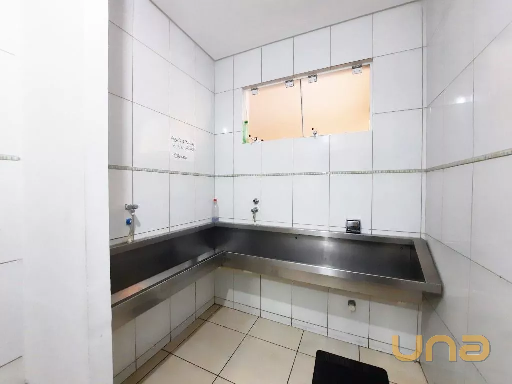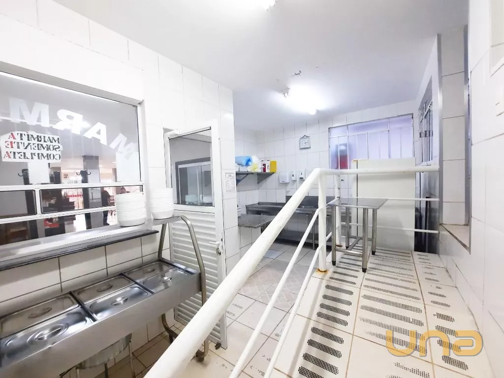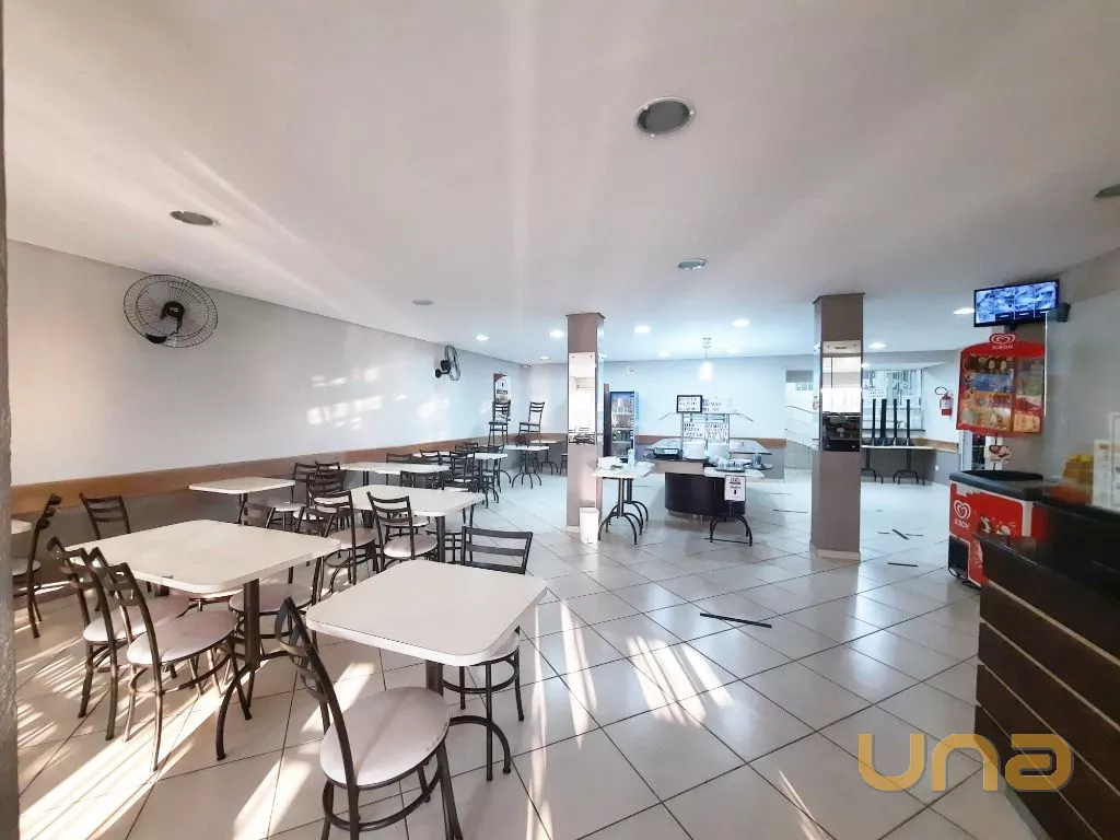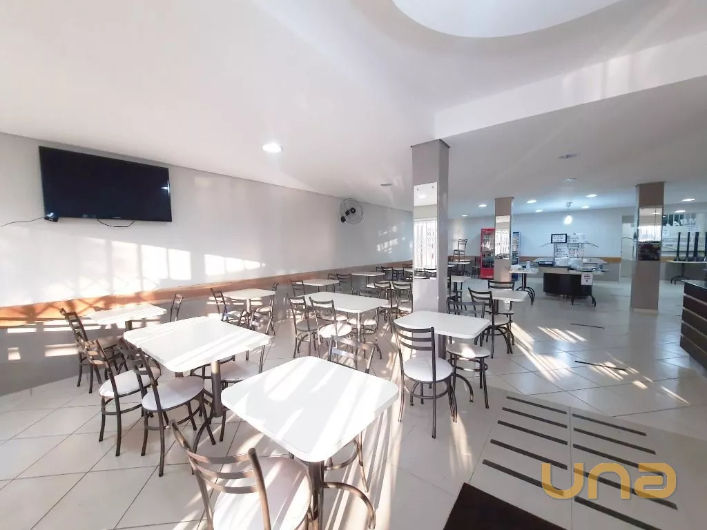 Salão amplo em vão livre, com mesas, cadeiras, buffet, recepção, sala de apoio com pratos, copos e talheres, cozinha de apoio com cuba, geladeira e buffet para marmita, banheiro feminino, masculino e PNE, despensa para alimentos, despensa para embalagens e cozinha ampla completa