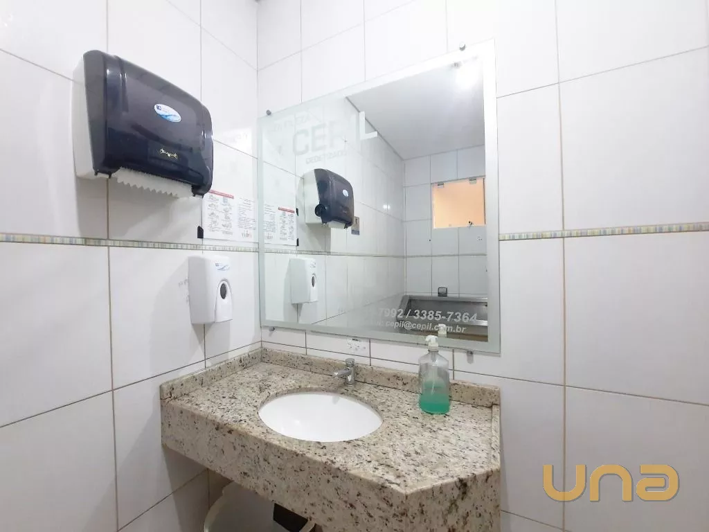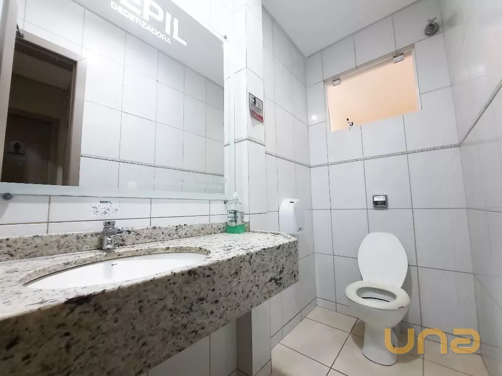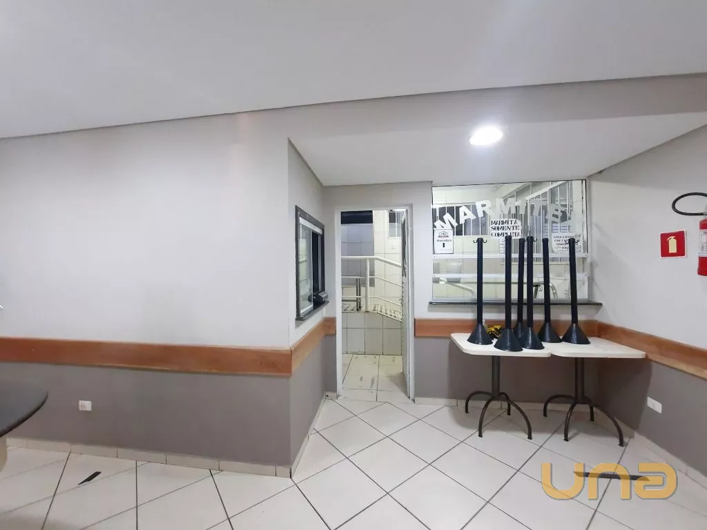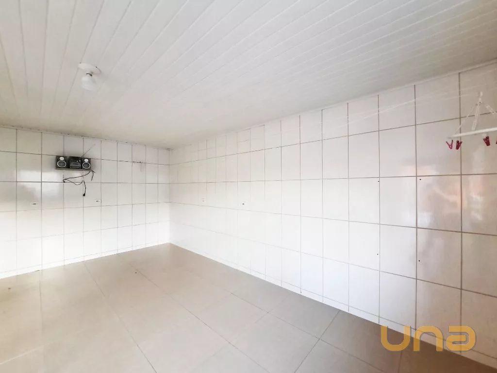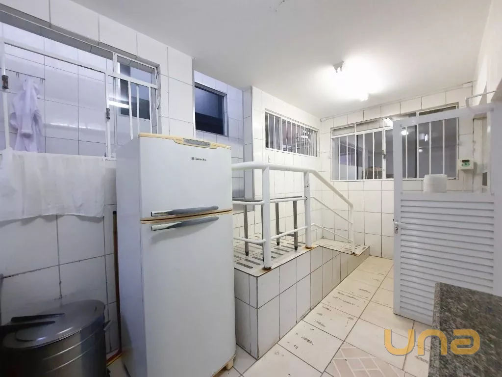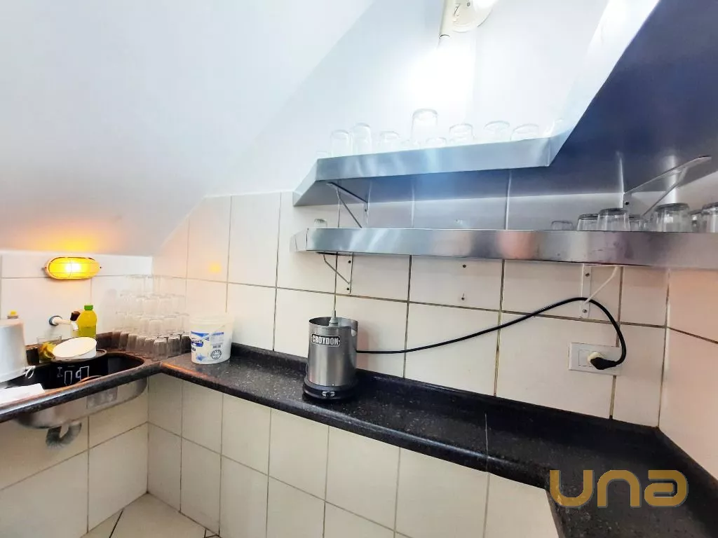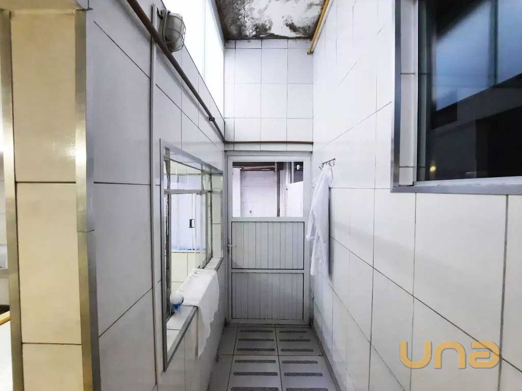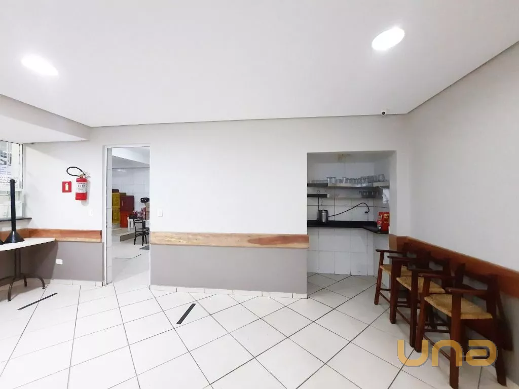 Salão amplo em vão livre, com mesas, cadeiras, buffet, recepção, sala de apoio com pratos, copos e talheres, cozinha de apoio com cuba, geladeira e buffet para marmita, banheiro feminino, masculino e PNE, despensa para alimentos, despensa para embalagens e cozinha ampla completa